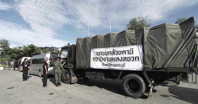 ขบวนรถบรรทุกต้นกล้วยตานีจำนวน 60 ต้น เคลื่อนออกจากศาลากลางจังหวัดเพชรบุรี เพื่อส่งมอบไปยังโรงเรียนพระตำหนักสวนกุหลาบ กทม. เพื่อใช้แทงหยวกประดับพระจิตกาธานในพระราชพิธีถวายพระเพลิงพระบรมศพ