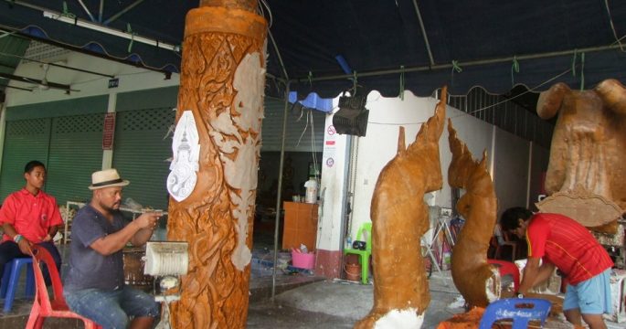 วัดชุมชนเมืองบุรีรัมย์เร่งแกะสลักต้นเทียนเข้าร่วมงานแห่เทียนพรรษา แม้ปีนี้งบสนับสนุนจากท้องถิ่นน้อย และ สตง.มีระบบเข้มงวด แต่ทุกฝ่ายช่วยกันสมทบทุนสร้างต้นเทียน