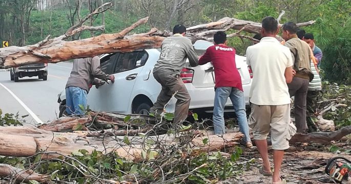 ต้นยางนายักษ์อายุนับร้อยปี ริมถนน อ.จตุรพักตรพิมาน จ.ร้อยเอ็ด ล้มทับรถกระบะสองผัวเมีย ได้รับบาดเจ็บ