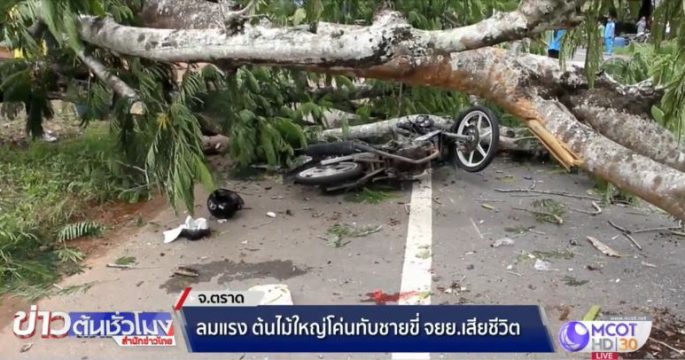 ลมกระโชกแรง ทำต้นไม้ใหญ่ล้มทับชายวัย 50 ปี ขณะขี่รถจักรยานยนต์ผ่านมาพอดี เสียชีวิต