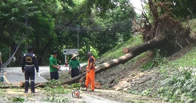 เชียงใหม่ 20 ส.ค.-เชียงใหม่ฝนตกหนัก ทำต้นไม้ใหญ่หักโค่นลงมาทั้งต้น ทับสายไฟทำให้เสาไฟฟ้าหัก 2 ต้น เจ้าหน้าที่ต้องปิดถนนทางขึ้นสถานีวิจัยและเกษตรพื้นที่สูงเชียงใหม่ เร่งตัดต้นไม้ เพื่อเปิดเส้นทาง ฝนที่ตกหนักในตัวเมืองเชียงใหม่ ทำให้ต้นไม้ใหญ่ความสูงเกือบ 10 เมตร บริเวณทางขึ้นสถานีวิจัยและเกษตรพื้นที่สูง ต.สุเทพ อ.เมืองเชียงใหม่ โค่นลงมาทั้งต้นแบบถอนรากถอนโคน ล้มขวางถนน และยังทับสายไฟฟ้าจนทำให้เสาไฟฟ้าหักไปอีก 2 ต้น เจ้าหน้าที่ต้องปิดเส้นทางชั่วคราว เพื่อเร่งตัดต้นไม้ที่กีดขวางเส้นทางจราจรขึ้นไปยังร้านอาหารและสถานีวิจัยเกษตรบนพื้นที่สูง และม้วนเก็บสายไฟและสายโทรศัพท์ไปไว้ข้างทาง ส่วนเสาไฟฟ้าบางต้น มีรอยหักบริเวณโคนต้น ปูนกะเทาะออกมาจนเห็นเหล็กเส้น และมีความเสี่ยงที่จะล้มลงมา ได้ตลอดเวลา เจ้าหน้าที่ต้องเร่งดำเนินการแก้ไข เพื่อไม่ให้เป็นอันตรายกับประชาชนที่สัญจรผ่านไปมา ทั้งนี้ สาเหตุน่าจะมาจากต้นไม้มีความสูงและใบจำนวนมาก เมื่อฝนตกและมีลมกระโชกแรง ทำให้รากและลำต้นรับน้ำหนักไม่ไหว โค่นล้มลงมาทั้งต้น เจ้าหน้าที่เทศบาลตำบลสุเทพ เปิดเผยว่า ในช่วงหน้าฝนปีนี้ มีประชาชนมาทำเรื่องขอตัดต้นไม้ใหญ่ที่อยู่ใกล้บ้าน เพื่อป้องกันต้นไม้ล้มใส่สิ่งปลูกสร้างและอาคารบ้านเรือน มากกว่า 80 ราย ซึ่งเจ้าหน้าที่ต้องทยอยดำเนินการตัดให้ จนคิวยาวนานนับเดือน.-สำนักข่าวไทย