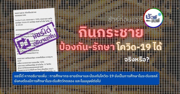 28 พฤษภาคม 2564 ตรวจสอบข้อเท็จจริง โดย : พีรพล อนุตรโสตถิ์, ภริตพร สุธีพิเชฐภัณฑ์ บนสังคมออนไลน์มีการแชร์ข้อมูลว่ากินกระชายสามารถป้องกันและรักษาโควิด-19 ได้ มีสรรพคุณในการต้านเชื้อไวรัสโควิด-19 ได้ดีกว่าขิงและฟ้าทะลายโจรได้มากถึง 10-20 เท่านั้น ศูนย์ชัวร์ก่อนแชร์ ตรวจสอบข้อมูลกับ ภญ.ดร.ผกากรอง ขวัญข้าว หัวหน้าศูนย์หลักฐานเชิงประจักษ์ โรงพยาบาลเจ้าพระยาอภัยภูเบศร พบว่า จริงบางส่วน บทสรุป จริงบางส่วน ต้องอธิบายเพิ่ม · กระชายเป็นเพียงส่วนหนึ่งในการดูแลสุขภาพเท่านั้น ไม่ใช่การกินเพื่อป้องกันหรือรักษาโควิด-19 ได้ · การศึกษากระชายรักษาและป้องกันโควิด-19 ยังเป็นการศึกษาในระดับเซลล์ ซึ่งพบว่าประสิทธิภาพของการยับยั้งเชื้อเมื่อเข้าสู่เซลล์ จะดีกว่าการป้องกันเชื้อเข้าสู่เซลล์ ยังคงต้องมีการศึกษาในระดับสัตว์ทดลอง และในมนุษย์ต่อไป · การป้องกันและรักษาโควิด-19 เป็นการรักษาสุขภาพแบบองค์รวม ไม่สามารถใช้ยาสมุนไพร หรือยาชนิดใดชนิดหนึ่ง ทำการรักษาเพียงอย่างเดียว · […]