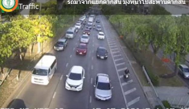 จราจรเช้าวันอังคาร สภาพการจราจรถนนกรุงธนบุรี ขาเข้า มุ่งหน้าขึ้นสะพานสมเด็จพระเจ้าตากสิน มีหนาแน่นช่วงกลางสะพาน ส่วนฝั่งขาออก มุ่งหน้าแยกตากสิน ยังเคลื่อนตัวได้ดี
