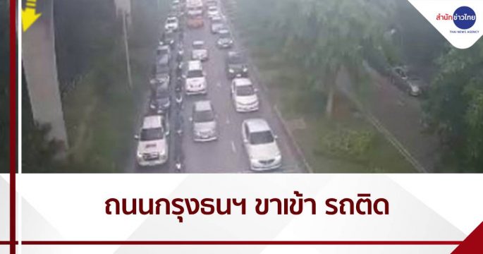 จราจรเช้าวันพฤหัสบดี ถนนกรุงธนบุรี ข้ามสะพานสมเด็จพระเจ้าตากสิน รถมาก ท้ายแถวสะสมใกล้ BTS วงเวียนใหญ่