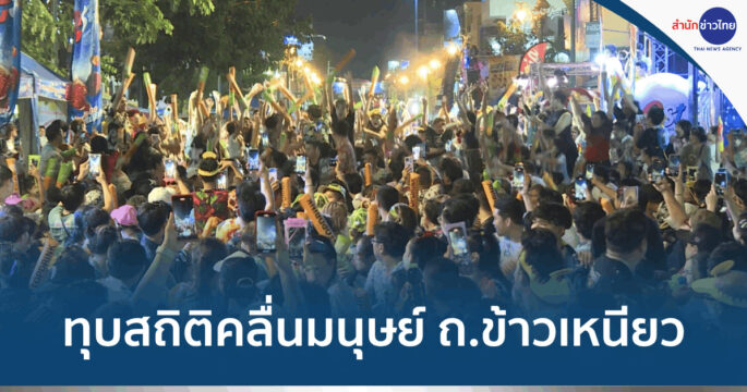 สุดมัน ถ.ข้าวเหนียว ขอนแก่น นักท่องเที่ยวร่วมเล่นคลื่นมนุษย์ไร้แอลกอฮอล์ วันสุดท้ายกว่า 160,000 คน ทุบสถิติการเล่นคลื่นมนุษย์สุดมิตรภาพที่จัดขึ้นครั้งแรกเมื่อปี 2562 ที่มีนักท่องเที่ยวร่วมเล่นคลื่นมนุษย์วันสุดท้าย 120,000 คน