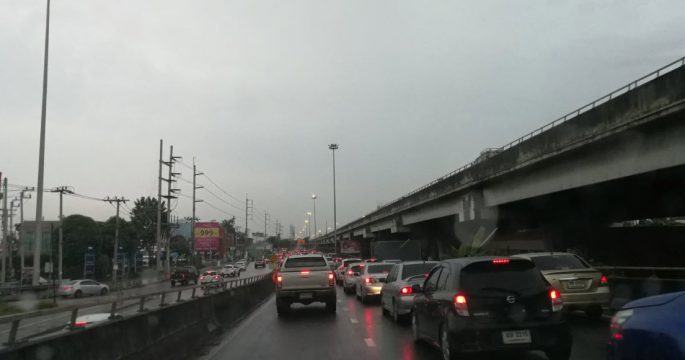 จราจรเช้าวันจันทร์ ฝนตกชุ่มฉ่ำ ถนนประดิษฐ์มนูธรรม ขาเข้า จากต่างระดับวัชรพล มุ่งหน้าลาดพร้าว รถมาก เคลื่อนตัวช้า