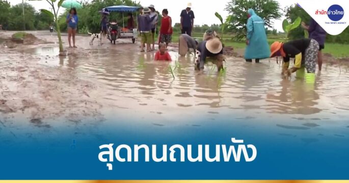 ชาวบ้านสุดทนถนนเป็นหลุมเป็นบ่อ พากันออกมาปลูกต้นไม้-ทอดแหหาปลากลางถนน ประชด หาหน่วยงานรับผิดชอบ
