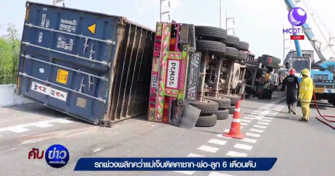 นาทีชีวิต รถพ่วง 18 ล้อพลิกคว่ำชนราวสะพานต่างระดับทำให้ลูกชายวัย 6 เดือนพร้อมกับพ่อคนขับ ส่วนภรรยาบาดเจ็บติดซากรถ เจ้าหน้าที่ต้องใช้เวลาเกือบ 30 นาทีในการช่วยเหลือชีวิต