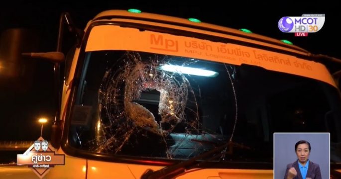 เตือนภัยแก๊งป่วน ทิ้งก้อนหินใส่รถบรรทุก ช่วงสะพานรถข้ามบางพลีน้อย ถนนมอเตอร์เวย์ ต.บางพลีน้อย อ.บางบ่อ จ.สมุทรปราการ กระจกหน้าแตกทะลุ คนขับบาดเจ็บ เศษกระจกเข้าตา
