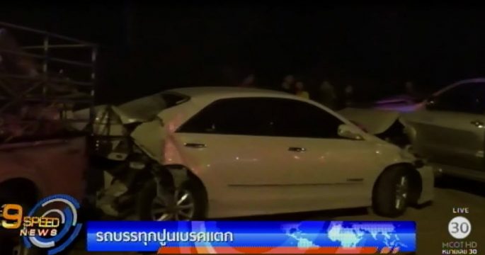 รถสิบล้อบรรทุกไม้ยูคาลิปตัสเบรกแตกทางโค้งลงเนินเขาจัน ถนนมิตรภาพ ช่วงอำเภอมวกเหล็ก จ.สระบุรี พุ่งชนท้ายรถกระบะ รถยนต์ และรถจักรยานยนต์ มีผู้บาดเจ็บ 2 คน