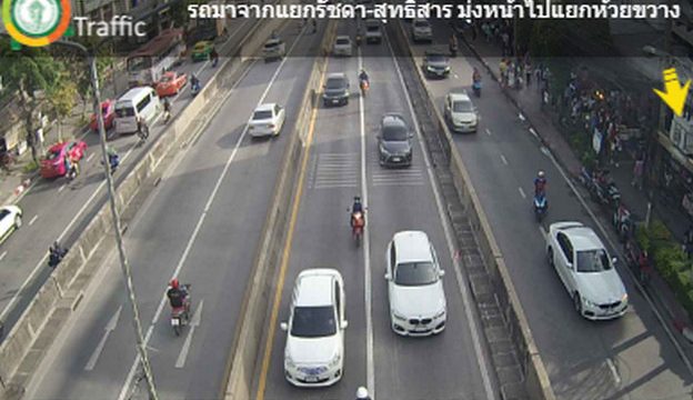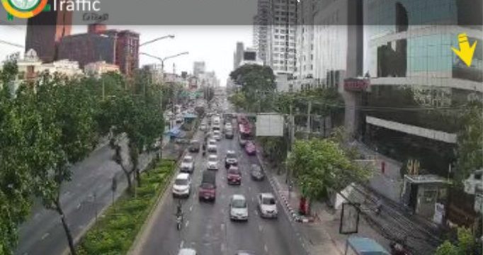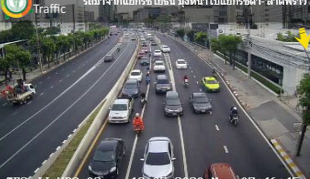จราจรเช้าวันพฤหัสบดี ถนนรัชดาภิเษก ขาเข้า จากแยกห้วยขวาง มุ่งหน้าแยกเทียมร่วมมิตร รถมาก