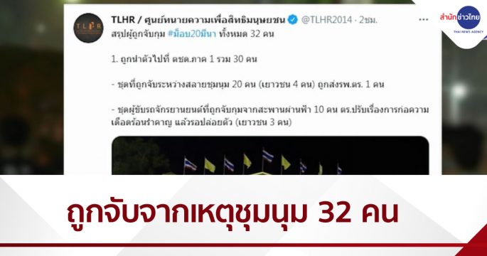 ศูนย์ทนายความเพื่อสิทธิและมนุษยชนทวีตข้อความผ่านทวิตเตอร์ ระบุมีผู้ถูกจับกุมจากเหตุการณ์ชุมนุมเมื่อคืนที่ผ่านมา 32 คน