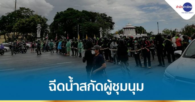 เจ้าหน้าที่ฉีดน้ำสกัดผู้ชุมนุมที่พยายามตัดรั้วลวดหนามเข้าไปใช้ถนนราชดำเนินเป็นเส้นทางหลักมุ่งสู้ทำเนียบรัฐบาล