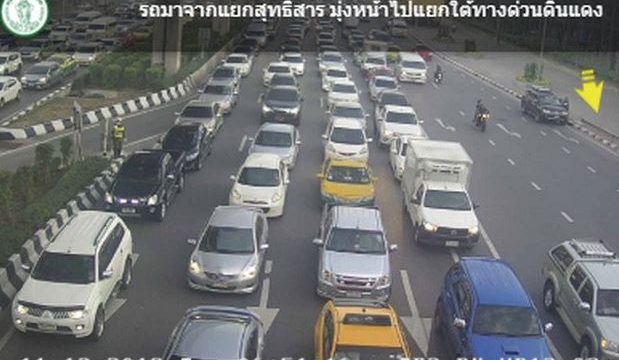 จราจรเช้าวันอังคาร ถนนวิภาวดีฯ ขาเข้า มุ่งหน้าใต้ทางด่วนดินแดง รถมาก เคลื่อนตัวช้า ถนนกรุงธนบุรี มุ่งหน้าสะพานตากสิน เข้าแยกสุรศักดิ์-สาทร รถมาก