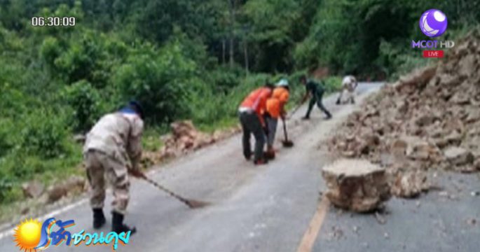 ฝนตกหนักบริเวณชายแดน จ.ตาก ส่งผลให้ดินภูเขาถล่มปิดทับเส้นทางสายแม่สอด-อุ้มผาง หวิดทับรถยนต์ชาวบ้าน เจ้าหน้าที่ต้องตักดินและเก็บเศษก้อนหินนานกว่า 1 ชม.