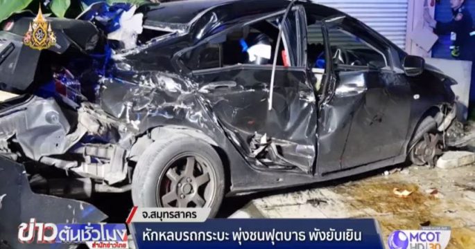 รถเก๋งหักหลบรถกระบะตัดหน้าเสียหลักพุ่งชนบ้านเรือนและร้านค้าบริเวณหน้าอาคารพาณิชย์ 3 ชั้น ริมถนนเอกชัย พังเสียหาย