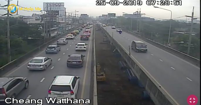 จราจรเช้าวันพุธ ถนนแจ้งวัฒนะ ขาเข้า ผ่านหน้า รพ.มงกุฏวัฒนะ รถเคลื่อนตัวได้ช้า ส่วนถนนพิบูลสงคราม มุ่งหน้าใต้สะพานพระราม 7 รถติดขัดมาก