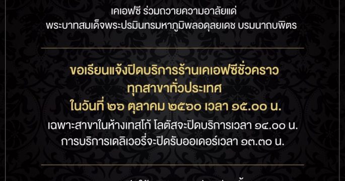 ร้านเคเอฟซีทั่วประเทศปิดให้บริการชั่วคราว 26 ต.ค. ตั้งแต่ 15.00 น. เปิดโอกาสพนักงานร่วมถวายความอาลัย