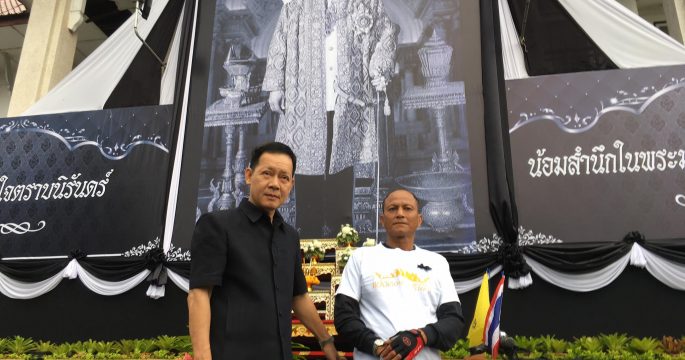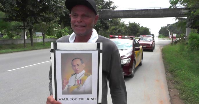 ไมเคิล แฮมมิล ชาวออสเตรเลียถือพระบรมสาทิศลักษณ์เดินจากสุราษฎร์ธานีถึงเขตชุมพรแล้ว เพื่อเข้า กทม.ถวายความอาลัย ท่ามกลางประชาชนต้อนรับให้กำลังใจอย่างดี