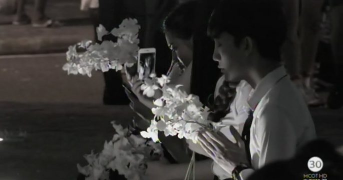 ประชาชนจำนวนมากใช้เวลาหลังเลิกงาน นำดอกไม้มาวางที่โต๊ะวางดอกไม้บริเวณรอบกำแพงพระบรมมหาราชวัง เพื่อเป็นการถวายสักการะ