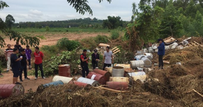 อุตสาหกรรมจังหวัดชลบุรีลงพื้นที่บางละมุงเก็บตัวอย่างพิสูจน์จากถังต้องสงสัยลอบทิ้งใกล้แหล่งน้ำ 50 ใบ ห่วงกระทบชุนชนหากเป็นสารเคมีอันตราย ด้านเทศบาลฯ จัดชุดเฝ้าระวังพื้นที่ระหว่างรอผลตรวจ