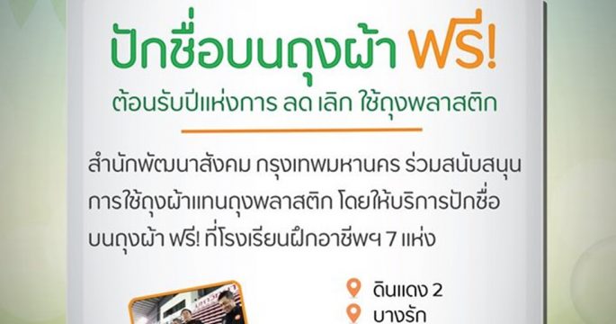 กทม.ให้บริการปักชื่อนามสกุลบนถุงผ้าฟรี เพื่อให้ประชาชนได้ใช้ถุงผ้าที่มีเอกลักษณ์แทนการใช้ถุงพลาสติก เริ่มวันแรก 6 ม.ค.นี้ ที่โรงเรียนฝึกอาชีพของกทม.7 แห่ง