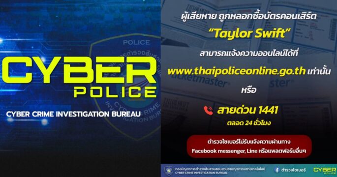 ตำรวจไซเบอร์แนะเหยื่อตั๋วผีคอนเสิร์ต “Taylor Swift” ที่ถูกหลอกสามารถแจ้งความออนไลน์ได้ที่ thaipoliceonline.go.th เท่านั้น
