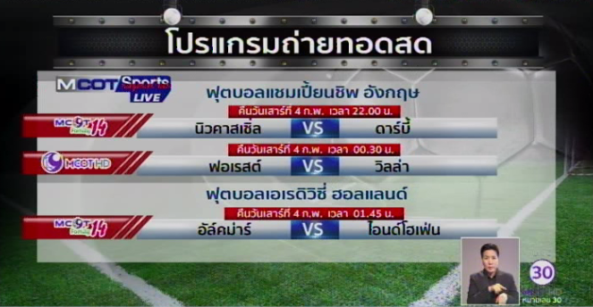 MCOT FAMILY ช่อง 14 ถ่ายทอดสดฟุตบอล เอเรดิวิซี่ ลีก ของฮอลแลนด์ 2 คู่