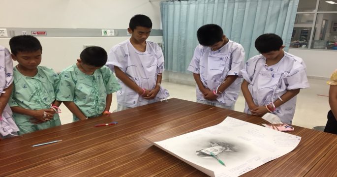น้องๆ 13 ชีวิตทีมหมูป่าอะคาเดมี ยืนไว้อาลัยและแสดงความเสียใจ หลังทราบเรื่องราวของ นาวาตรีสมาน กุนัน เสียชีวิตจากการปฏิบัติภารกิจในครั้งนี้
