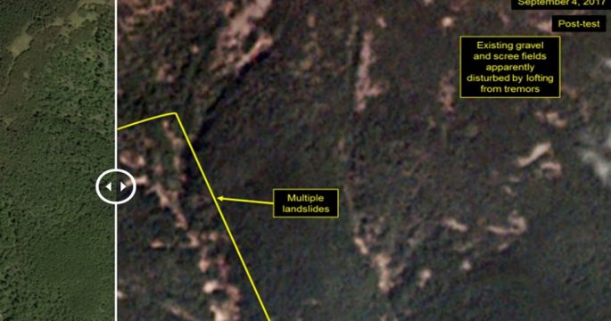 ภาพถ่ายจากดาวเทียมเผยให้เห็นว่าพื้นดินบริเวณที่ทำการทดลองนิวเคลียร์ของเกาหลีเหนือเกิดการสไลด์ลงไปในธารน้ำที่อยู่ใกล้เคียง