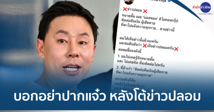 “ทนายตั้ม” ซัด “บอสพอล” อย่าปากแจ๋ว หลังออกมาโต้ข่าวปลอมคืนเงินผู้เสียหาย ด้าน “บอสพอล” โพสต์ตั้งศูนย์เยียวยาผู้เสียหาย พร้อมให้ข้อมูลแก่กระบวนการยุติธรรม