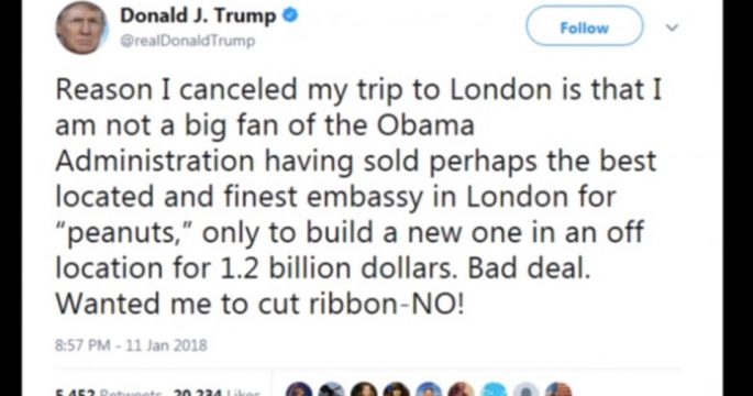 ประธานาธิบดีโดนัลด์ ทรัมป์ของสหรัฐยกลิกกำหนดการเยือนอังกฤษในปีนี้ โดยอ้างว่าไม่พอใจที่รัฐบาลประธานาธิบดีบารัค โอบามาขายสถานทูต