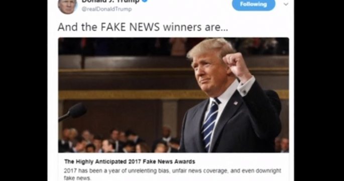 ประธานาธิบดีโดนัลด์ ทรัมป์ของสหรัฐเปิดเผยรายชื่อผู้ได้รับรางวัลข่าวเท็จประจำปี 2560 ด้วยการทวีตลิงก์จากบล็อกของพรรครีพับลิกัน