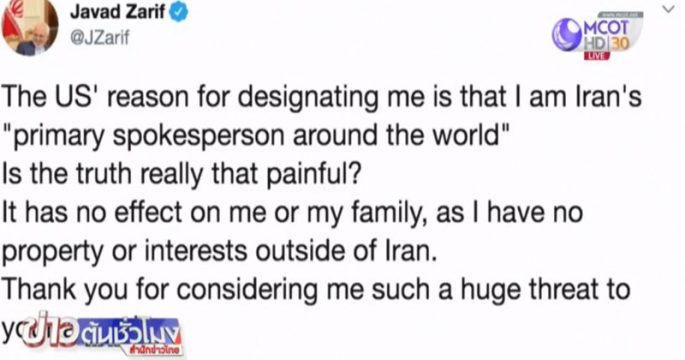 รัฐมนตรีต่างประเทศอิหร่านโพสต์ข้อความลงในทวิตเตอร์ระบุเขาและครอบครัวไม่ได้รับผลกระทบจากการถูกสหรัฐคว่ำบาตรทางการเงิน