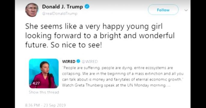ประธานาธิบดีโดนัลด์ ทรัมป์ของสหรัฐทวีตถึงเกรตา ธุนเบิร์ก สาวสวีเดนที่รณรงค์เรื่องการเปลี่ยนแปลงสภาพภูมิอากาศว่าดูมีความสุขดี