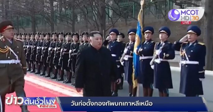 นายคิม จองอึน ผู้นำเกาหลีเหนือ ตรวจแถวทหารกองเกียรติยศ เนื่องในโอกาสเดินทางเยี่ยมกระทรวงกองทัพ เพื่อร่วมฉลองวันก่อตั้งกองทัพประชาชนเกาหลีซึ่งดำเนินมาครบ 71 ปี