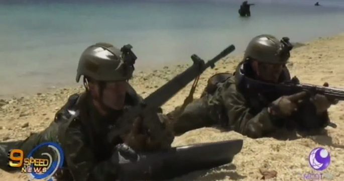 ทหารญี่ปุ่นเข้าร่วมซ้อมรบยกพลขึ้นบก ด้วยเรือยางที่ชายหาดบนเกาะกวมของสหรัฐ ขณะที่ทหารสหรัฐเลื่อนหมายกำหนดการซ้อมรบด้วยกระสุนจริงบนเกาะกวม