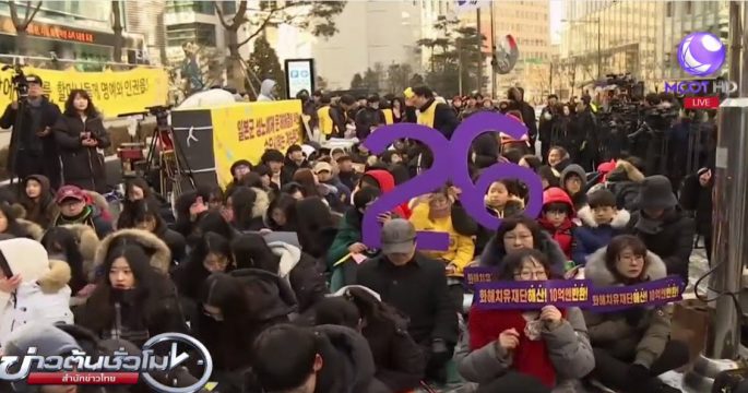 ชาวเกาหลีใต้ชุมนุมประท้วงใกล้กับสถานทูตญี่ปุ่น ในกรุงโซล เพื่อเรียกร้องให้ข้อตกลงเรื่องหญิงบำเรอกามทหารญี่ปุ่นระหว่างรัฐบาลทั้งสองประเทศที่ทำไว้เมื่อปี 2558 เป็นโมฆะ