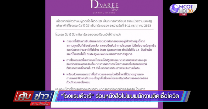 โรงแรม ดีวารี ดีว่า เซ็นทรัล ระยอง ออกหนังสือชี้แจงไม่มีนโยบายรับลูกเรือ-ชาวต่างชาติที่ไม่ผ่าน State Quarantineและขณะนี้ไม่พบพนักงานติดเชื้อโควิด-19