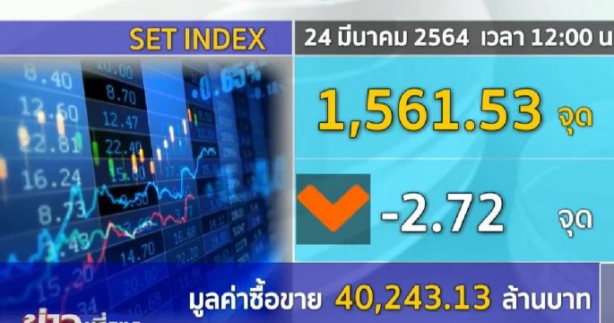ตลาดหุ้นไทยภาคเช้า ดัชนีลดลงตามตลาดต่างประเทศ ดัชนีช่วงเที่ยงอยู่ที่ 1,561.53 ติดลบ 2.72 จุด มูลค่าชื้อขาย 40,243.13 ล้านบาท