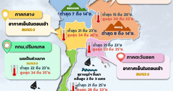 กรมอุตุฯ เผยภาคเหนือ ภาคตะวันออกเฉียงเหนือ ภาคกลาง และภาคตะวันออก ยังคงมีอากาศเย็นถึงหนาวในตอนเช้ากับมีลมแรง ภาคใต้มีฝนลดลง อ่าวไทยคลื่นสูง