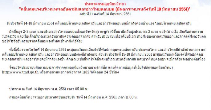 กรมอุตุฯ เตือนไทยมีฝนฟ้าคะนองหลายพื้นที่ ตกหนักบางแห่งบริเวณภาคเหนือ ภาคตะวันออกเฉียงเหนือ ภาคกลาง ภาคตะวันออก และภาคใต้ ระวังน้ำท่วมฉับพลัน น้ำป่าไหลหลาก ทะเลคลื่นสูง 2-3 เมตร กรุงเทพฯ และปริมณฑล ฝนฟ้าคะนอง 70% ของพื้นที่ ส่วนมากในช่วงบ่ายถึงค่ำ อุณหภูมิต่ำสุด 26-27 องศาเซลเซียส อุณหภูมิสูงสุด 31-35 องศาเซลเซียส.