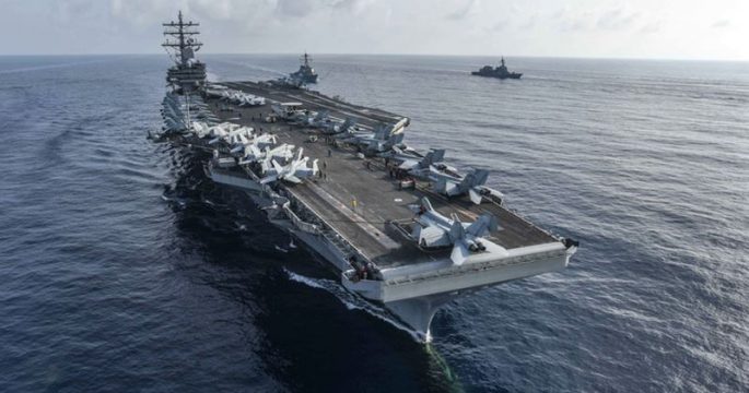เรือบรรทุกเครื่องบินยูเอสเอสโรนัลด์เรแกนของสหรัฐ พร้อมกองเรือติดอาวุธแล่นผ่านน่านน้ำอันเป็นพื้นที่พิพาทในทะเลจีนใต้เมื่อวานนี้ ท่ามกลางภาวะตึงเครียด