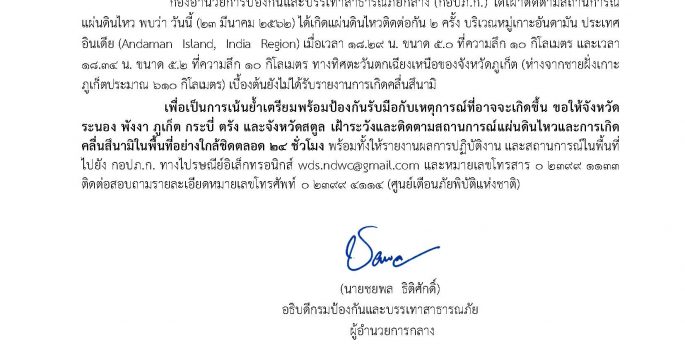 23 มี.ค.-อธิบดี ปภ. ออกประกาศแจ้งเตือน จ.ภูเก็ต พังงา กระบี่ ระนอง ตรัง สตูล เฝ้าระวังติดตามการเกิดสึนามิ หลังเกิดเหตุแผ่นดินไหวในทะเล 2 ครั้งต่อเนื่องทางทิศตะวันตกเฉียงเหนือของ จ.ภูเก็ต ห่างจากชายฝั่งภูเก็ตราว 610 กม. ทั้งนี้ประชาชนในพื้นที่ภูเก็ตระบุว่ารับรู้ได้ถึงแรงสั่นสะเทือน แต่จนถึงขณะนี้ยังไม่มีรายงานการแจ้งเตือนการเกิดสึนามิตามมาแต่อย่างใด.-สำนักข่าวไทย