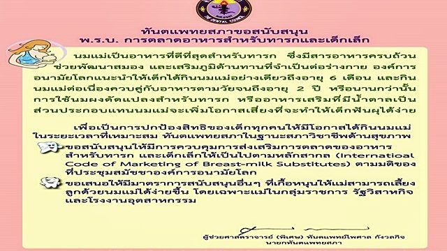 ทันตแพทยสภาหนุนกฏหมายคุมการตลาดนมผง ชี้ช่วยลดปัจจัยเสี่ยงฟันผุในเด็กเล็ก