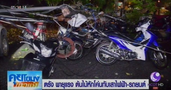 พายุกระหน่ำในเขตเทศบาลนครตรังนานกว่า 1 ชั่วโมง ต้นไม้ใหญ่หักโค่นล้มทับเสาและสายไฟฟ้า รถยนต์และจักรยานยนต์เสียหาย กว่า 10 คัน ส่วนที่ฉะเชิงเทรา ชาวบ้านขนของหนีน้ำป่า