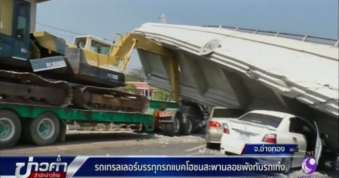 รถเทรลเลอร์บรรทุกรถแบคโฮ ชนสะพานลอยคนข้าม ถนนสายเอเชีย จ.อ่างทอง พังลงมาทับรถยนต์ 2 คัน มีผู้บาดเจ็บเป็นหญิง 2 ราย