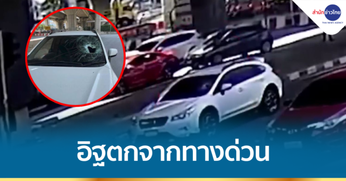 หนุ่มผวา จอดรถรอสัญญาณไฟอยู่ดีๆ มีก้อนอิฐปริศนาปลิวตกลงมาจากทางด่วน โดนรถพังเสียหาย