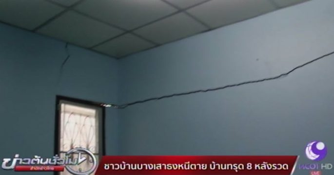 ชาวบ้าน 7 ครอบครัวที่อาศัยอยู่ที่หมู่บ้านแสงตะวัน ถนนเทพารักษ์ อำเภอบางเสาธง จังหวัดสมุทรปราการ เร่งอพยพข้าวของหนีตาย หลังทาวน์เฮาส์ชั้นเดียวเกิดการทรุดตัว แตกร้าวต่อเนื่องกันถึง 8 หลัง