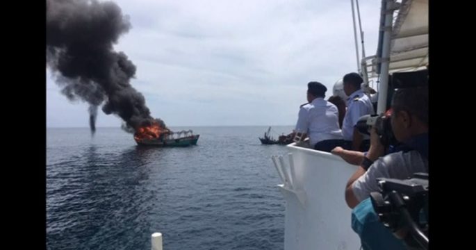 มาเลเซียเผาเรือประมงต่างชาติที่ลอบเข้ามาทำประมงอย่างผิดกฎหมายเป็นลำแรกในวันนี้เพื่อแสดงความจริงจังในการจัดการกับเรือประมงล่วงล้ำน่านน้ำ